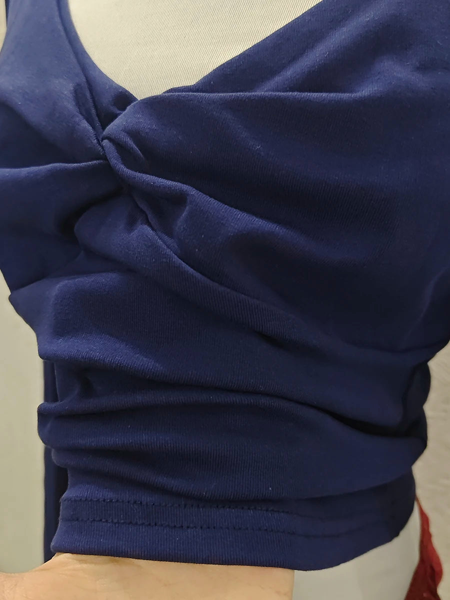 Navy Knot Long Sleeve T-shirt Woman Autumn V-neck Cotton Slim